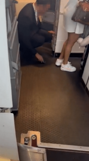 The flight attendant attempted to hid his disgraceful act by pretending to search through a drawer on the aircraft’s floor, which appeared to contain mini alcohol bottles.