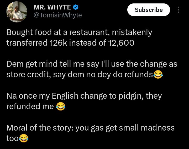 Uncomfortable with the arrangement, the customer insisted on a refund, switching from formal English to Pidgin in a bid to press the demand more firmly. “Na once my English change to pidgin, they refunded me,” the customer added.