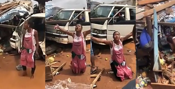 Lady narrowly escapes death as commercial bus crashes into her shop (Video)