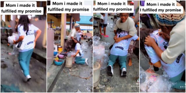 Lady surprises her mother after graduation, rushes to market, and kneels in dirty water before her mom, she signs on her shirt