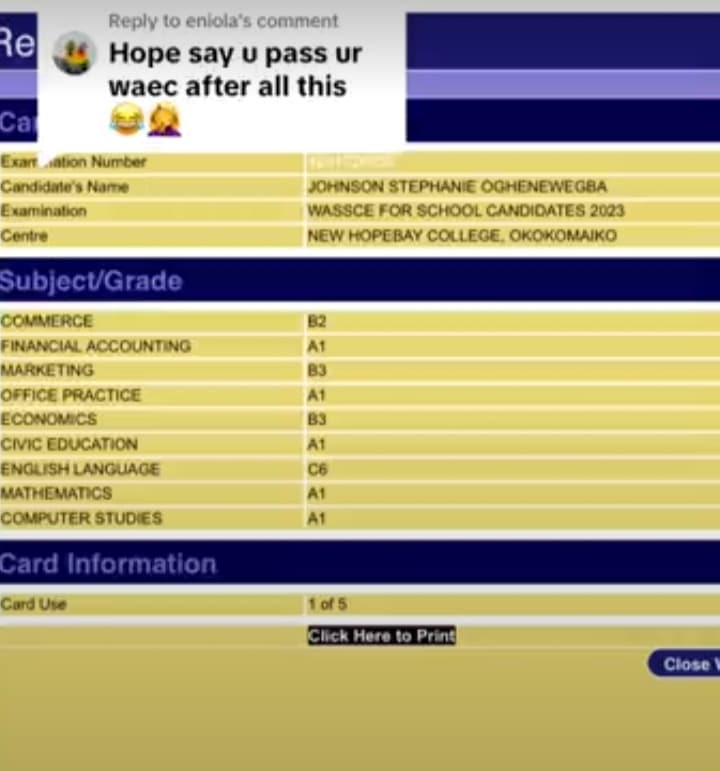 Rebecca went ahead to share her WAEC result online and it confirmed that she aced all her papers with 5as, 3bs and 1c.