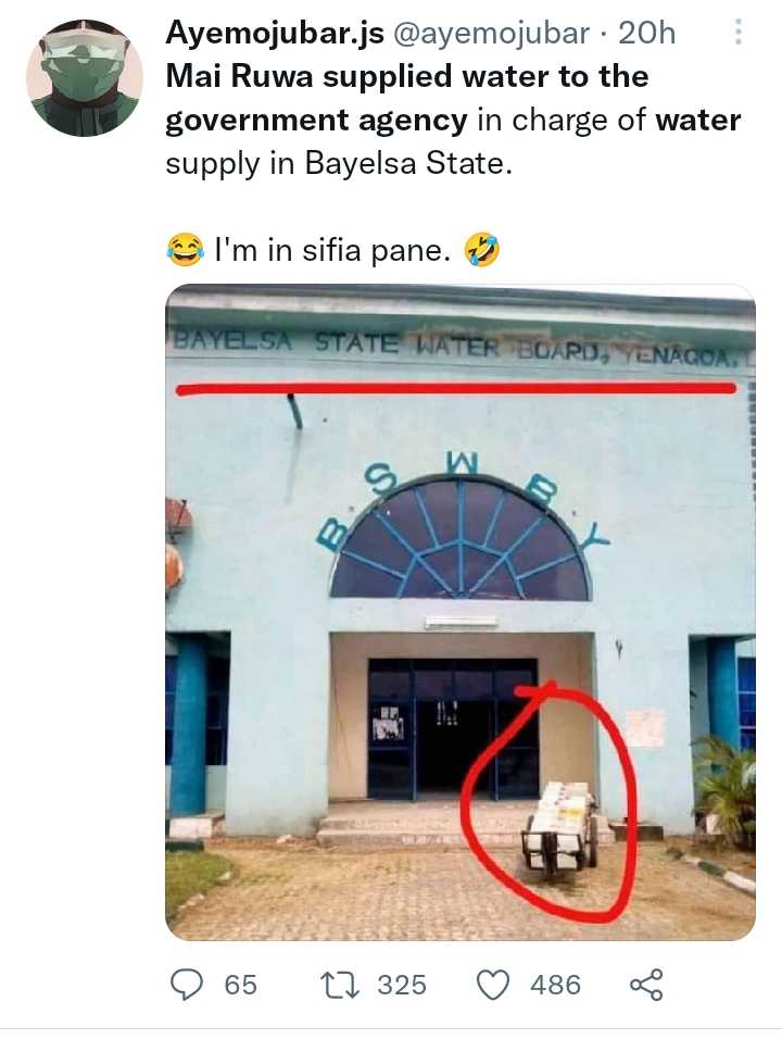 A photo making the rounds on social media depict an irony of a water vendor (popularly known as Mai Ruwa) reportedly supplying water to Bayelsa State Water Board.