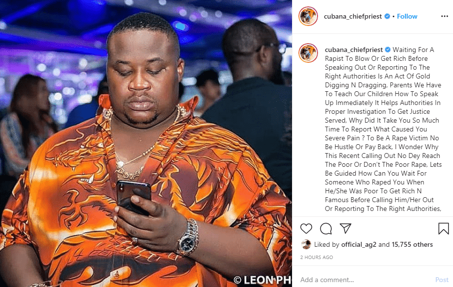 Waiting for a rapist to get rich before speaking out is an act of gold digging – Cubana Chief Priest