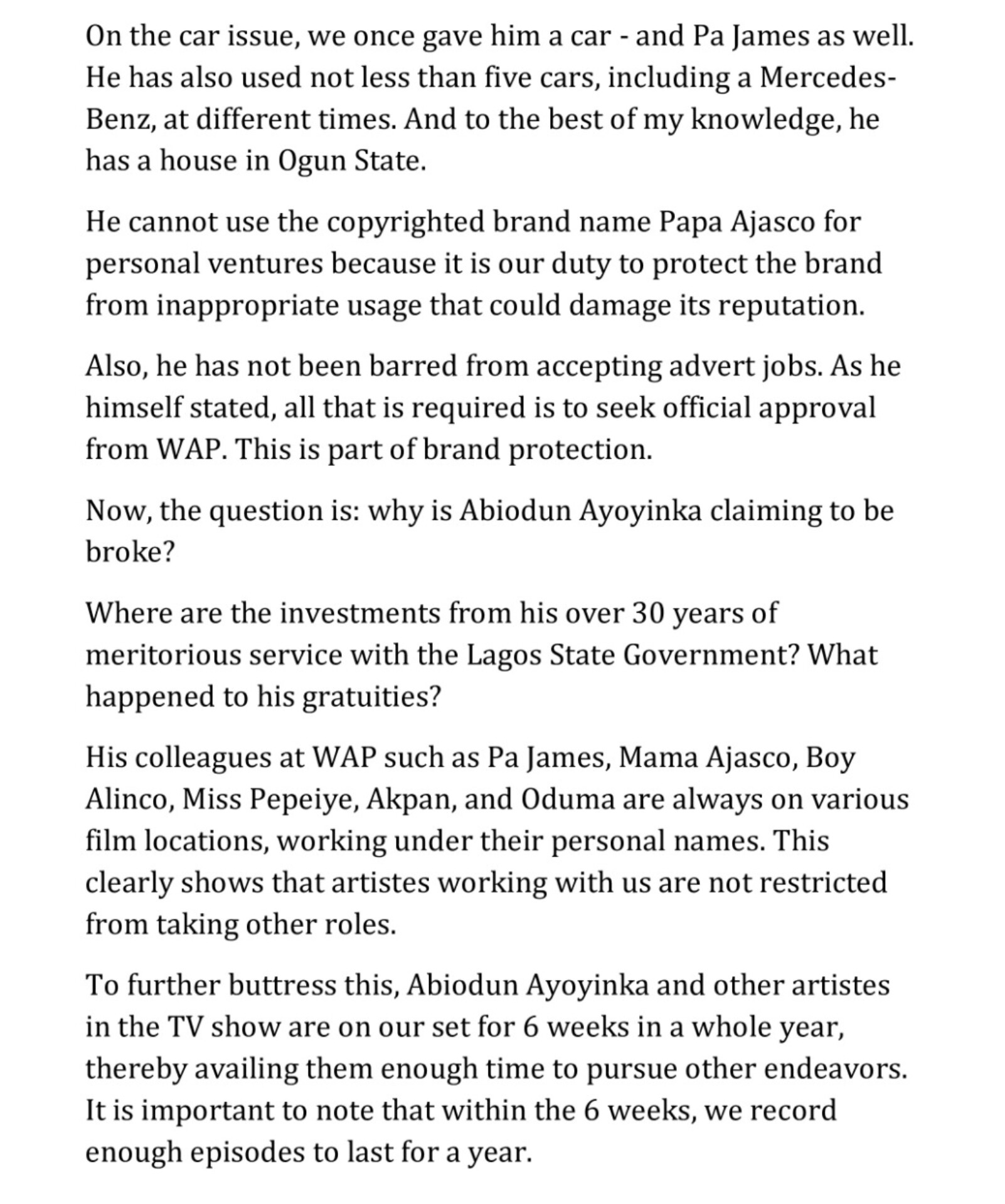 On the car issue, we once gave him a car – and Pa James as well. He has also used not less than five cars, including a MercedesBenz, at different times. And to the best of my knowledge, he has a house in Ogun State.