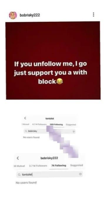 Crossdresser Bobrisky and Tonto Dikeh who have been in alleged beef with one another have finally proven the rumors to be true as the two former best friends finally unfollow each other on Instagram.