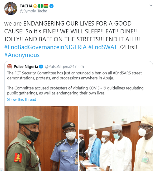 “we are ENDANGERING OUR LIVES FOR A GOOD CAUSE! So it’s FINE!! WE WILL SLEEP!! EAT!! DINE!! JOLLY!! AND BAFF ON THE STREETS!!! END IT ALL!!! #EndBadGovernanceinNIGERIA #EndSWAT 72Hrs!! #Anonymous” she tweeted.