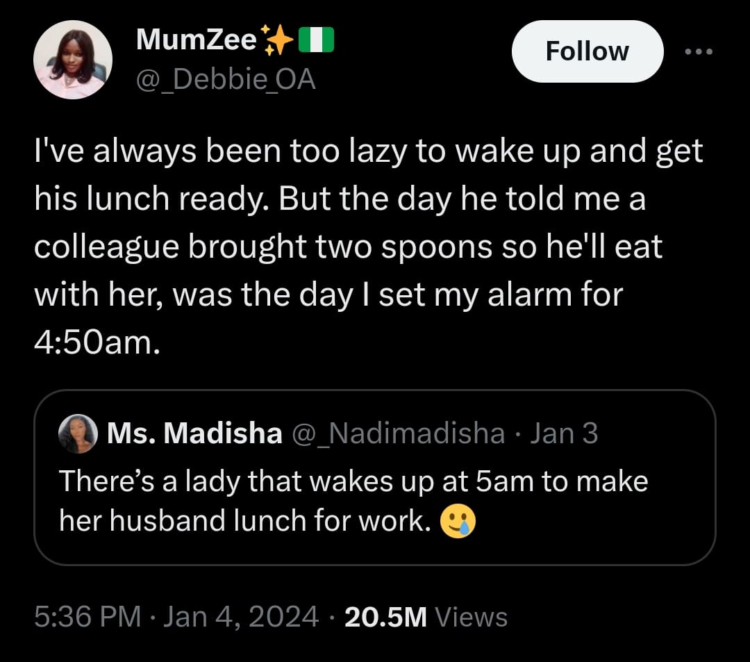She wrote: “I’ve always been too lazy to wake up and get his lunch ready. But the day he told me a colleague brought two spoons so he’ll eat with her, was the day I set my alarm for 4:50 am.”