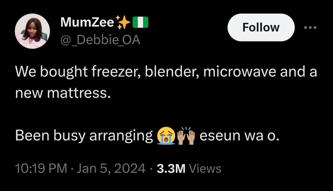 Her statement: “We bought a freezer, blender, microwave, and a new mattress. Been busy arranging 😭🙌🏽 eseun wa o.”