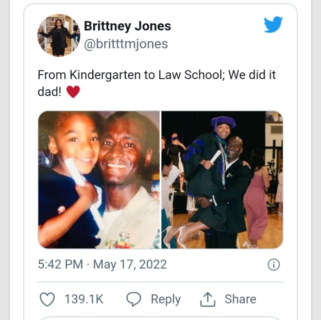 The young lawyer, identified as Brittney Jones, took to Twitter to share a throwback picture she took with her dad at her kindergarten graduation.