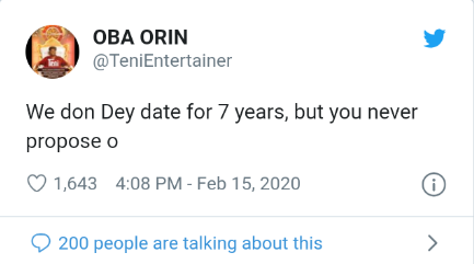 She wrote: “We don Dey date for 7 years, but you never propose o”