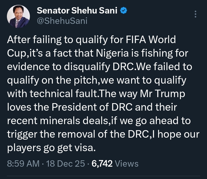 Former Kaduna Central Senator Shehu Sani has warned Nigeria against relying on technical grounds to disqualify the Democratic Republic of Congo (DR Congo) from the 2026 FIFA World Cup.