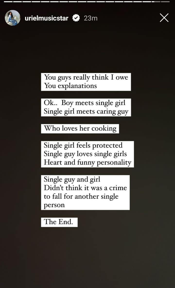 “You guys really think I owe You explanations Ok.. Boy meets single girl Single girl meets caring guy Who loves her cooking Single girl feels protected Single guy loves single girls Heart and funny personality Single guy and girl Didn’t think it was a crime to fall for another single person The End.”