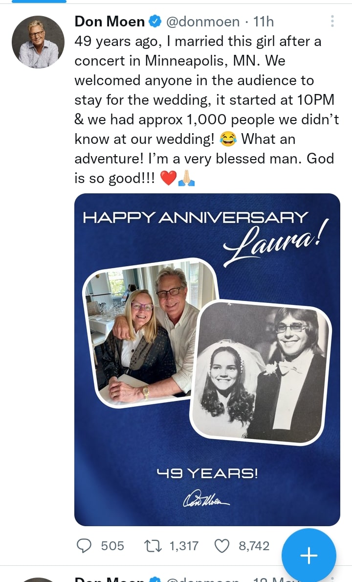 “49 years ago, I married this girl after a concert in Minneapolis, MN. We welcomed anyone in the audience to stay for the wedding, it started at 10PM & we had approx 1,000 people we didn’t know at our wedding! What an adventure! I’m a very blessed man. God is so good!!!”