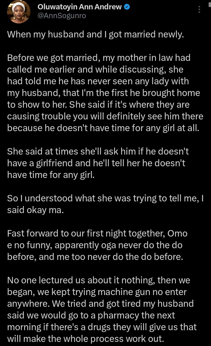 “When my husband and I got married newly, my mother-in-law had already told me I was the first woman he ever brought home. She said he never had time for relationships, so I understood. But on our first night, we realised both of us had no experience at all. We kept trying, but nothing seemed to work, and we got tired.”