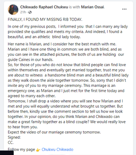 Chikwado Raphael Chukwu, a disability rights campaigner, has announced his emergency wedding to Marian Ossai, a visually impaired lady.