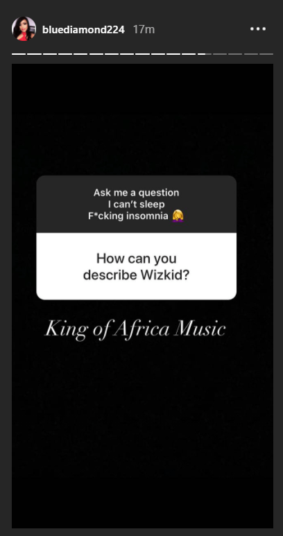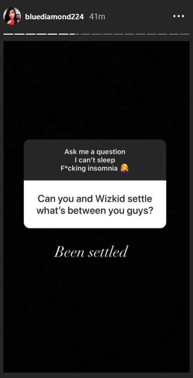 “Been settled” she replied to a question asking her and Wizkid to settle. “King of Africa music” she replied to another question asking her to describe Wizkid.