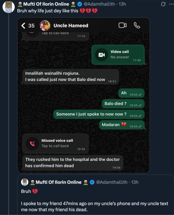 However, less than 50 minutes after the call, @Adamthallith received a shocking message from his uncle informing him that his friend had been rushed to the hospital but did not survive.