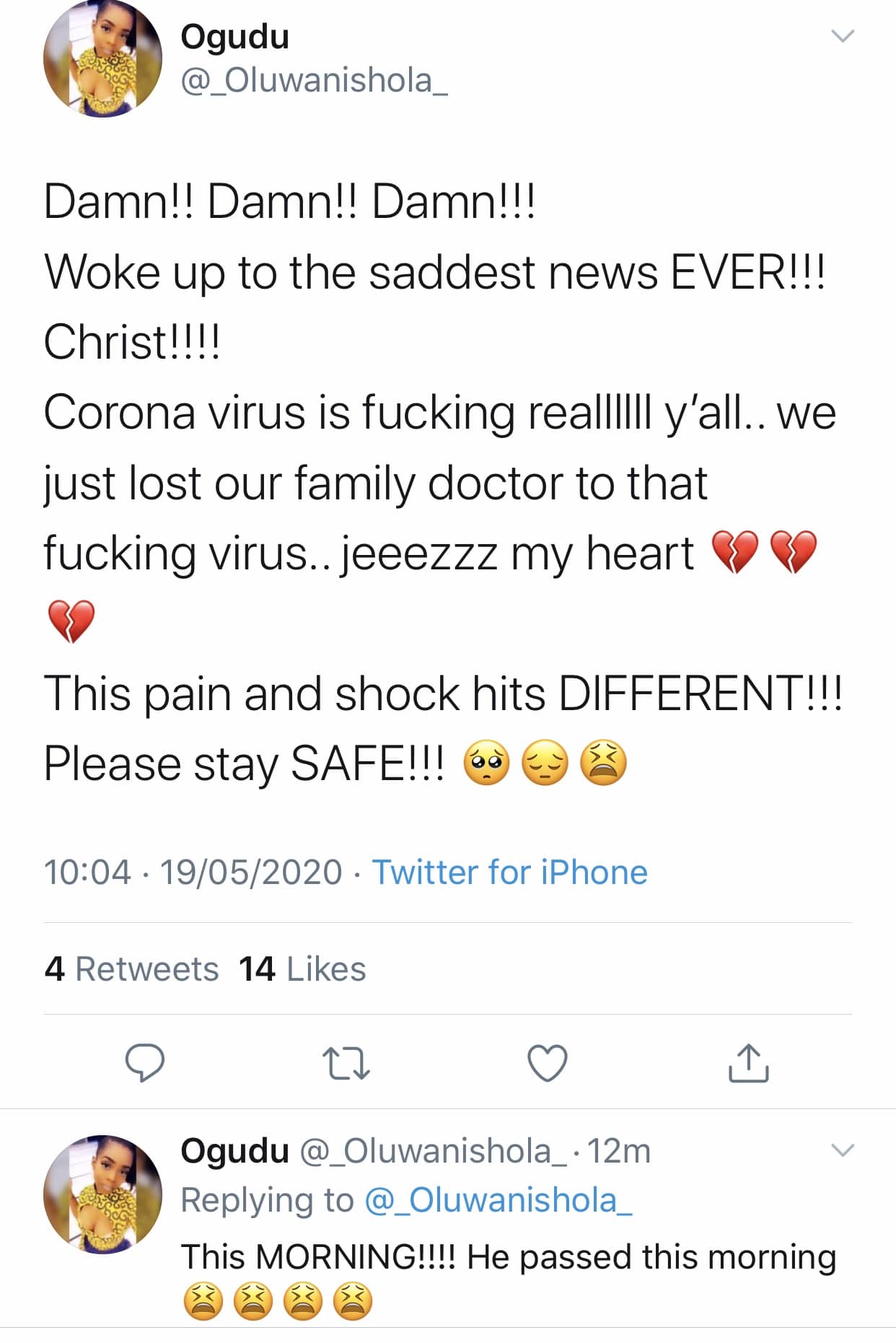 Wizkid’s first baby mama, Shola Ogudu, has revealed they have lost their family doctor to Covid-19.