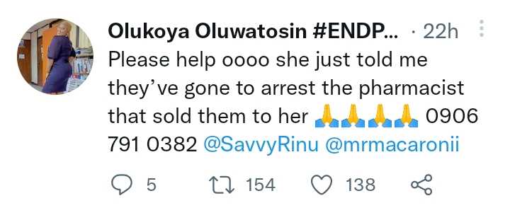 “Please help oooo, she just told me they’ve gone to arrest the pharmacist that sold them to her.”
