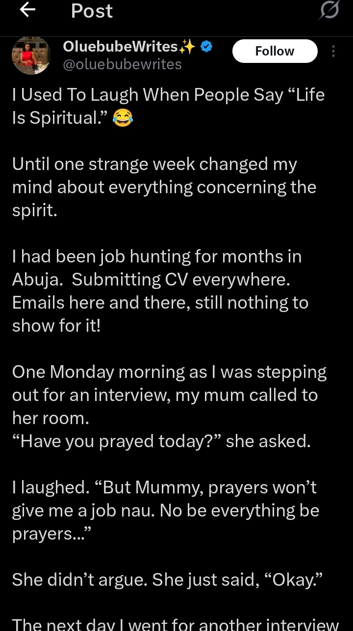 According to the X user, the incident during her job hunt changed her perspective about the spiritual aspect of life.