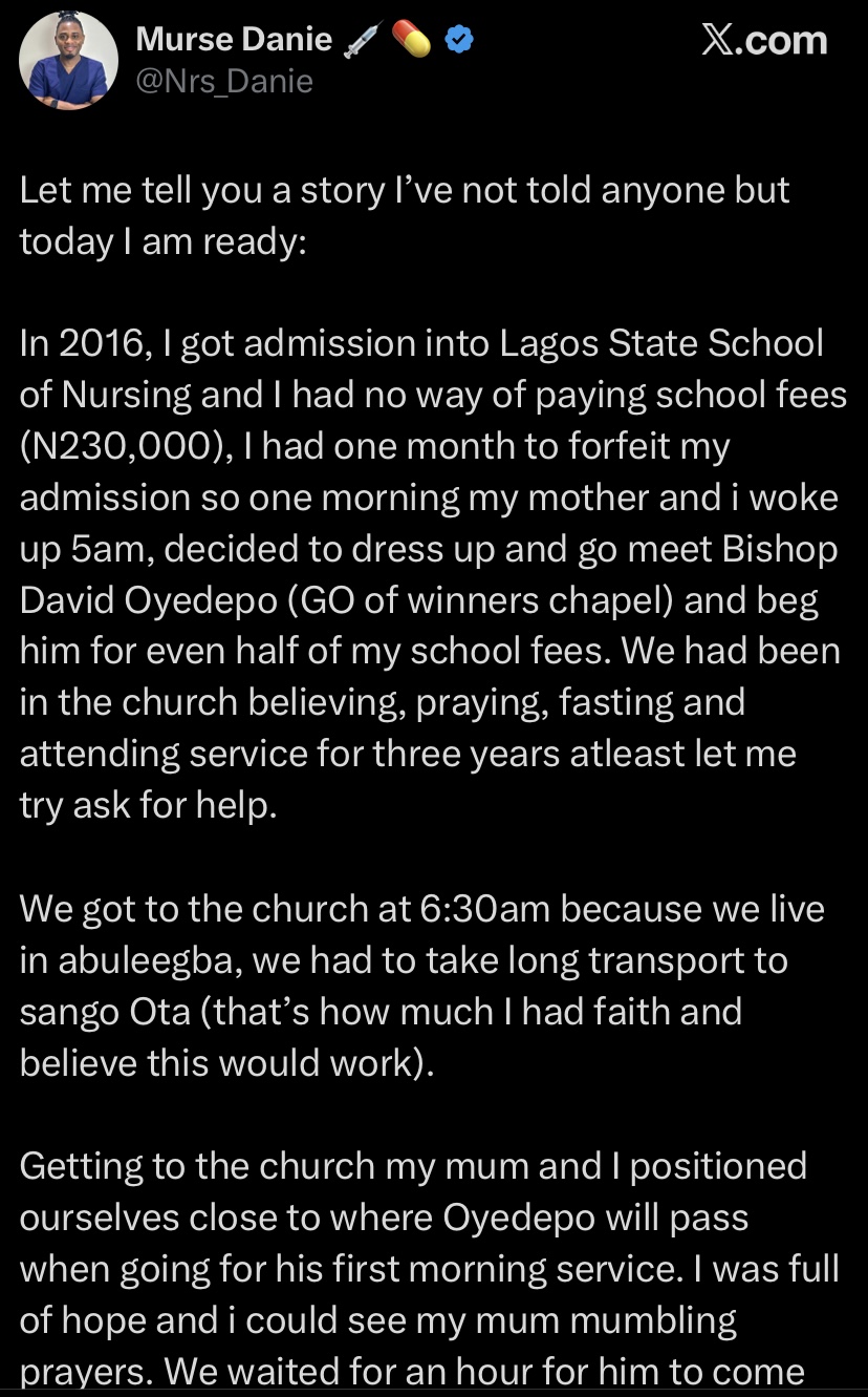 In 2016, I got admission into Lagos State School of Nursing and I had no way of paying school fees (N230,000), I had one month to forfeit my admission so one morning my mother and I woke up 5am, decided to dress up and go meet Bishop David Oyedepo (GO of Winners Chapel) and beg him for even half of my school fees. We had been in the church believing, praying, fasting and attending service for three years at least let me try ask for help.