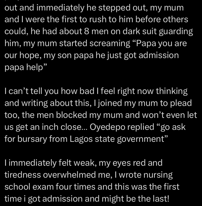 I can’t tell you how bad I feel right now thinking and writing about this, I joined my mum to plead too, the men blocked my mum and wouldn’t even let us get an inch close… Oyedepo replied ‘go ask for bursary from Lagos State Government’