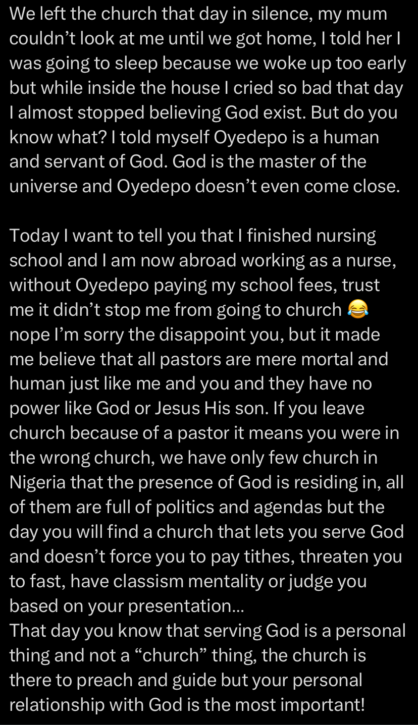 Today I want to tell you that I finished nursing school and I am now abroad working as a nurse, without Oyedepo paying my school fees… it didn’t stop me from going to church… but it made me believe that all pastors are mere mortals and human just like me and you and they have no power like God or Jesus His son.