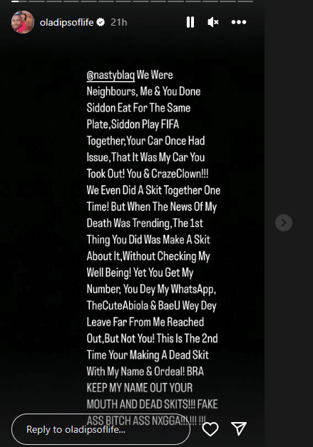 Nastyblaq had used his name and ordeal to make a skit content and, Oladips revealed that during the time his death was trending, he never reached out to him.