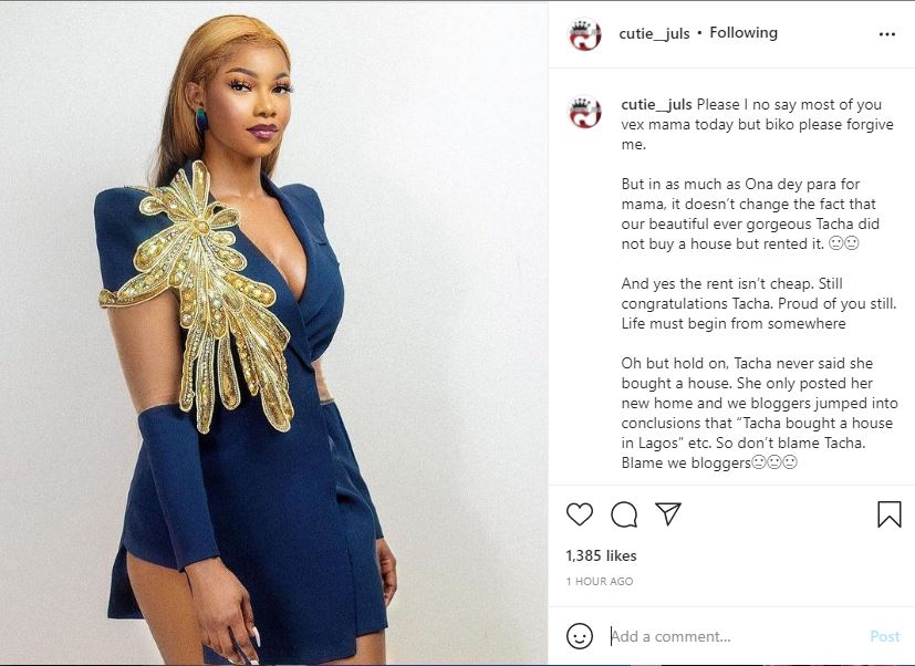 Controversial Instagram blogger, Cutie-julz has revealed more details about the new house acquired by the reality star, Tacha a few weeks back.