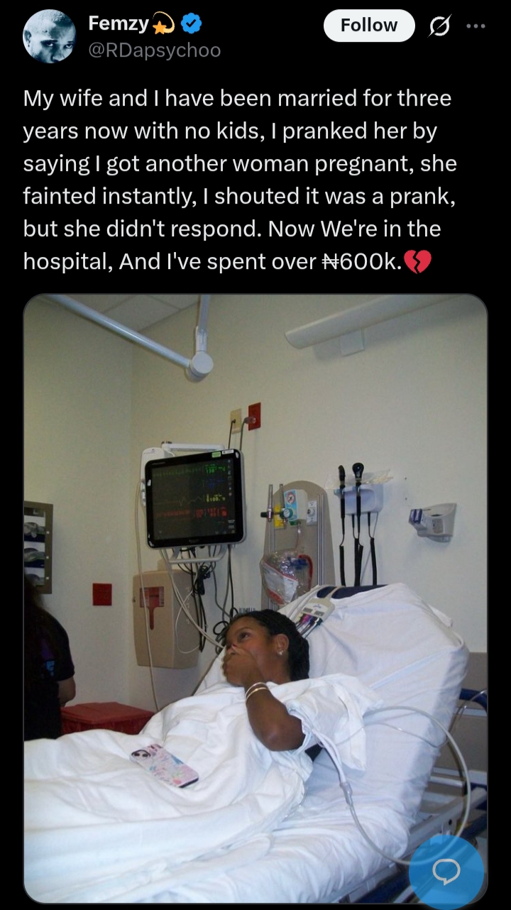 @RDapsychoo said: “My wife and I have been married for three years now with no kids, I pranked her by saying I got another woman pregnant, she fainted instantly, I shouted it was a prank, but she didn’t respond. Now We’re in the hospital, And I’ve spent over ₦600k.💔”