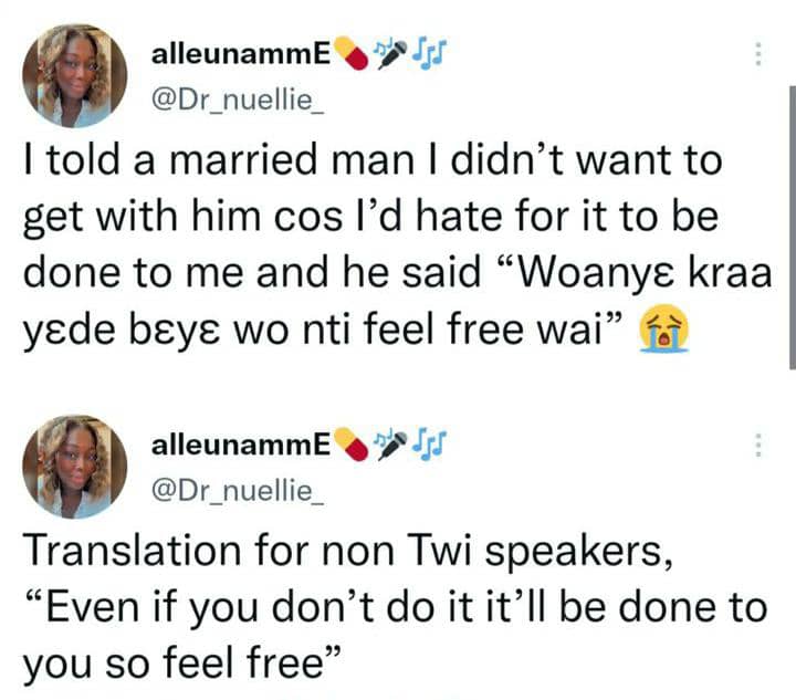 “I told a married man I didn’t want to get with him cos I’d hate for it to be done to me and he said “woanye kraa yede beye wo nti feel free wait” 😭.