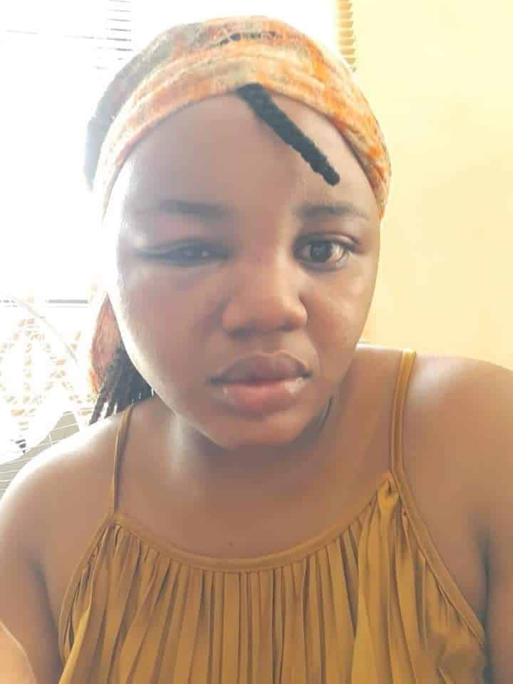 A South African lady identified as Odirile Didi Moeletsi took to her Facebook page to share photos of her swollen face and black eyes after she was allegedly beaten by her boyfriend on Saturday night.