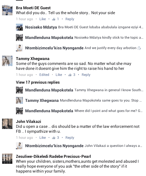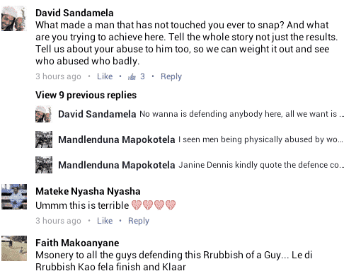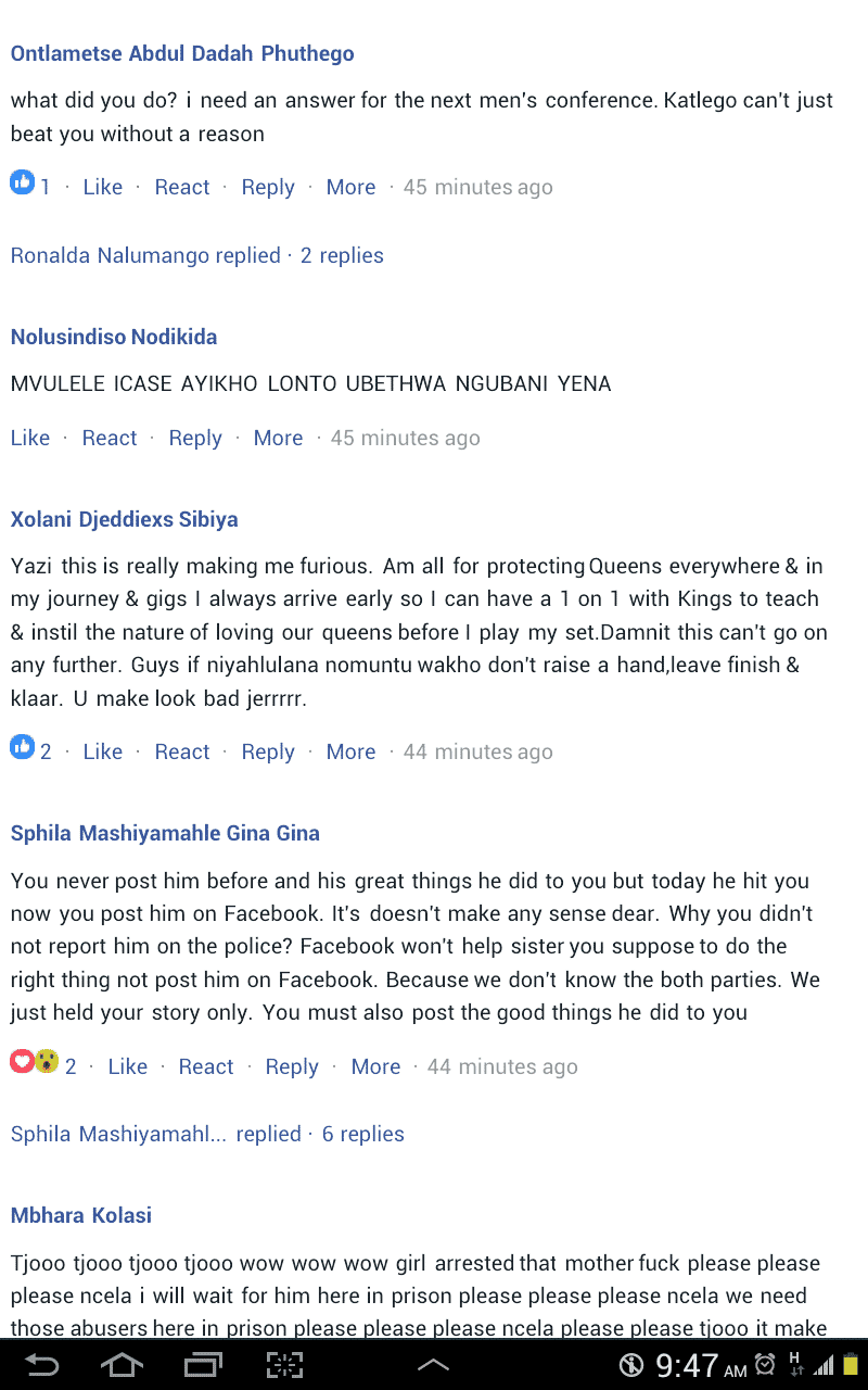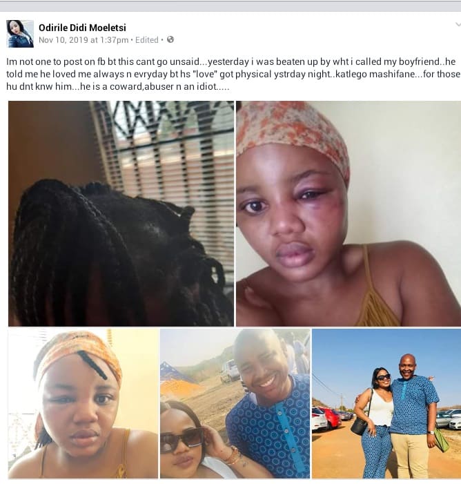 “Im not one to post on fb bt this cant go unsaid…yesterday i was beaten up by wht i called my boyfriend..he told me he loved me always n evryday bt hs “love” got physical ystrday night..katlego mashifane…for those hu dnt knw him…he is a coward,abuser n an idiot”