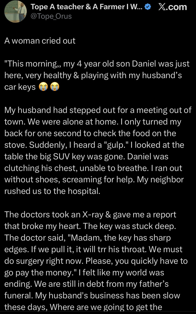 A mum has sparked emotional reactions online after sharing a terrifying experience involving her 4-year-old son, who reportedly swallowed a car key and was rushed to the hospital.