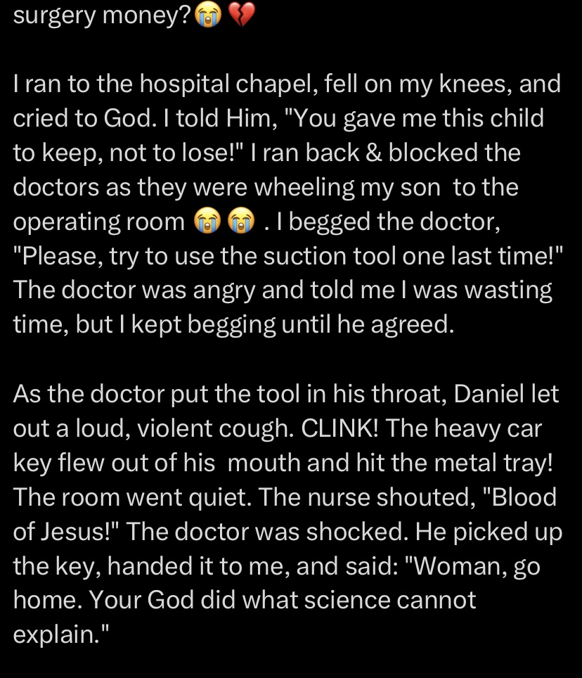 The doctor said, ‘Madam, the key has sharp edges. If we pull it, it will tear his throat. We must do surgery right now. Please, you quickly have to go pay the money.’ I felt like my world was ending.