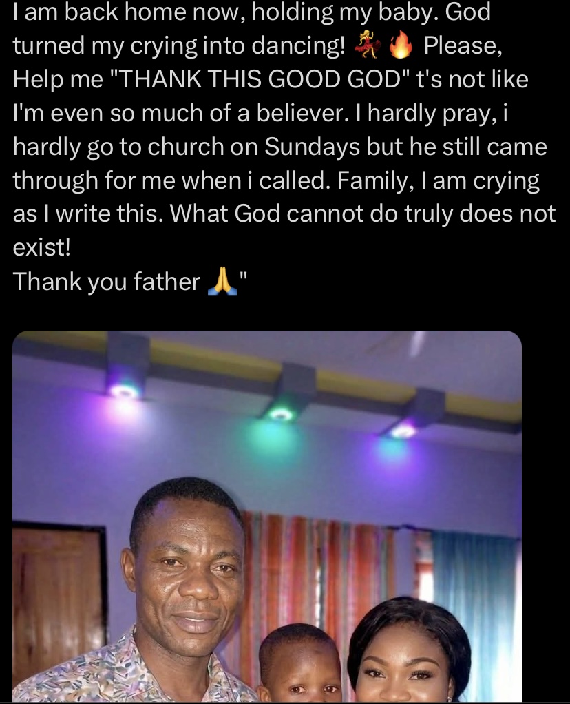 Please, help me thank this good God. It’s not like I’m even so much of a believer. I hardly pray, I hardly go to church on Sundays, but He still came through for me when I called. Family, I am crying as I write this. What God cannot do truly does not exist! Thank you, Father.”