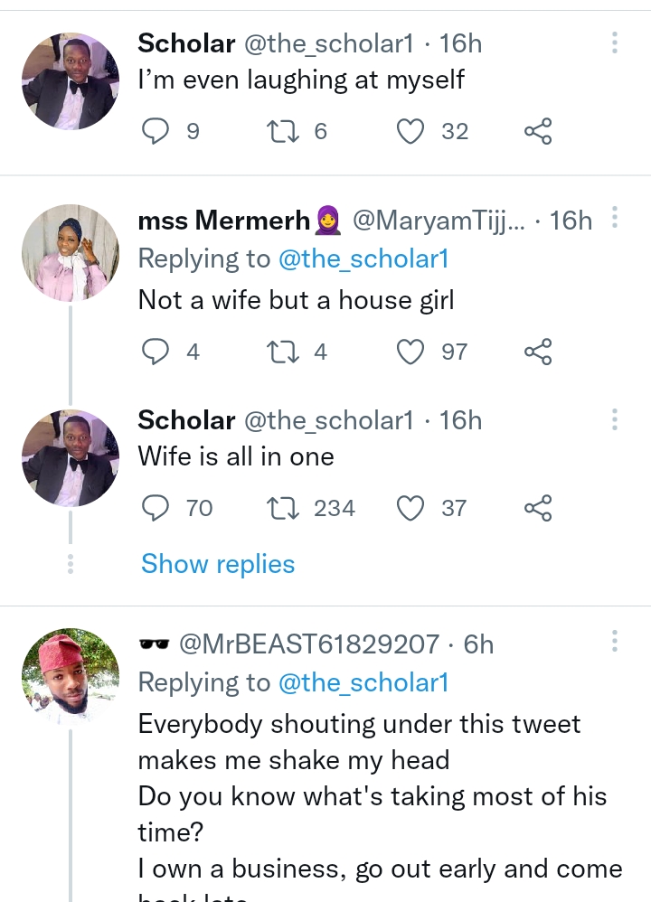 They stated that a wife isn’t a working machine and to keep his room clean shouldn’t be the main reason why he would want a wife.