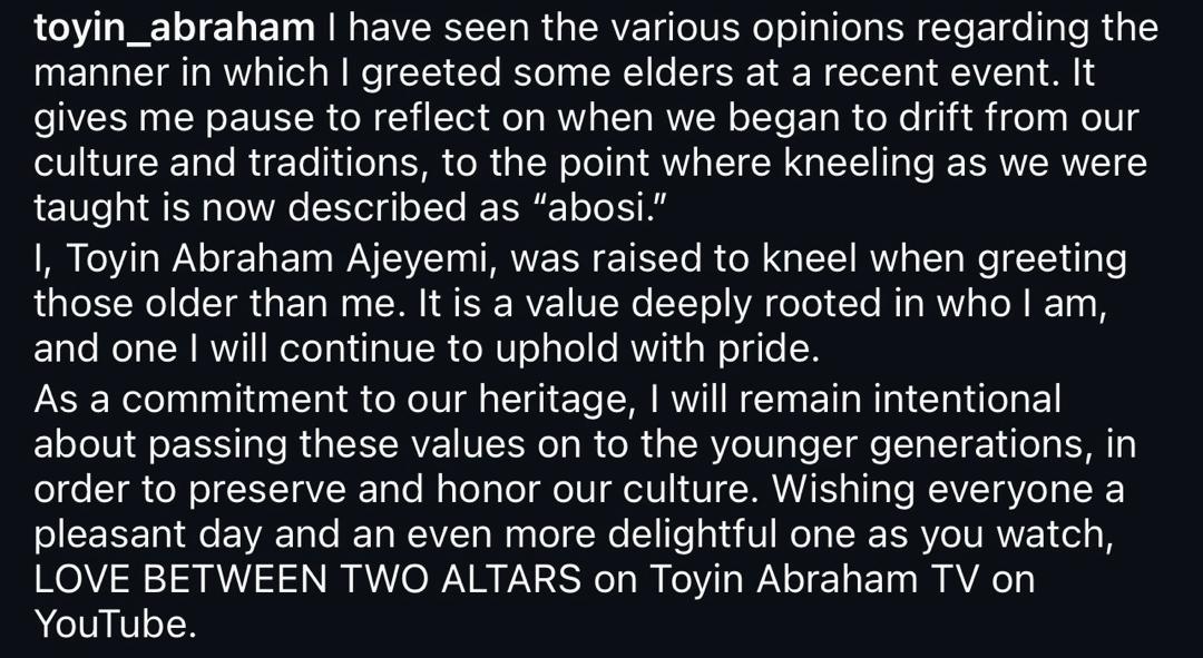 “I, Toyin Abraham Ajeyemi, was raised to kneel when greeting those older than me. It is a value deeply rooted in who I am, and one I will continue to uphold with pride. I will remain intentional about passing these values to younger generations,” she said.