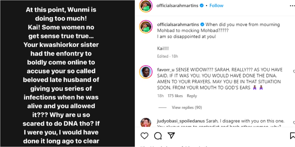 Actress Sarah Martins has taken to social media to attack Wunmi, the wife of the late artist Mohbad following recent banter with sister.