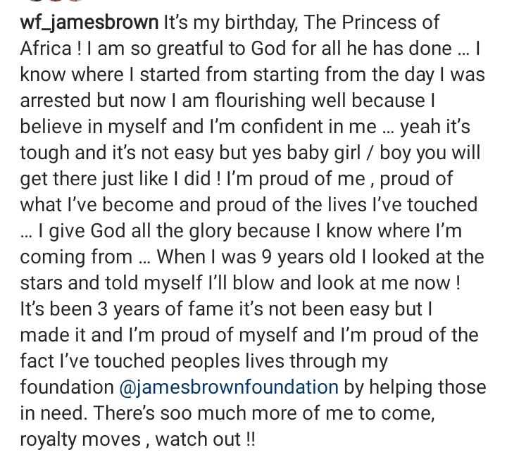 “It’s my birthday, The Princess of Africa ! I am so greatful to God for all he has done … I know where I started from starting from the day I was arrested but now I am flourishing well because I believe in myself and I’m confident in me … yeah it’s tough and it’s not easy but yes baby girl / boy you will get there just like I did ! I’m proud of me , proud of what I’ve become and proud of the lives I’ve touched … I give God all the glory because I know where I’m coming from … When I was 9 years old I looked at the stars and told myself I’ll blow and look at me now ! It’s been 3 years of fame it’s not been easy but I made it and I’m proud of myself and I’m proud of the fact I’ve touched peoples lives through my foundation @jamesbrownfoundation by helping those in need. There’s soo much more of me to come, royalty moves , watch out !!”