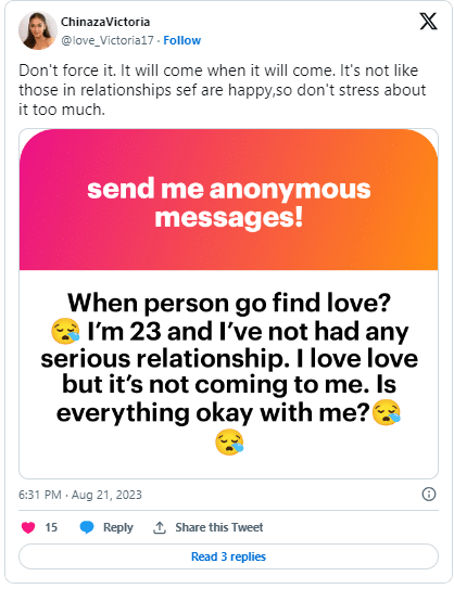 @love_Victoria17 commented; “Don’t force it. It will come when it will come. It’s not like those in relationships sef are happy, so don’t stress about it too much.”