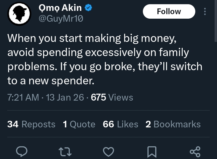 He wrote: “When you start making big money, avoid spending excessively on family problems. If you go broke, they’ll switch to a new spender.”