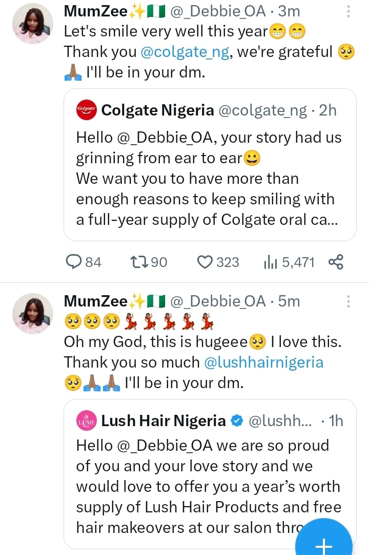 More gifts continue to flood in for the viral Mummy Zee as makers of Colgate, Indomie and Lush Hair reach out to her with offers for a year’s supply of their products.