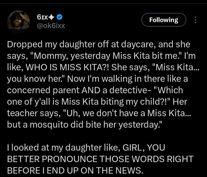 “I walked in there like a concerned parent AND a detective—‘Which one of y’all is Miss Kita biting my child?!’ Her teacher looked confused and said they didn’t have anyone by that name. It turned out my daughter was referring to a mosquito bite she had received the previous day,” she explained.