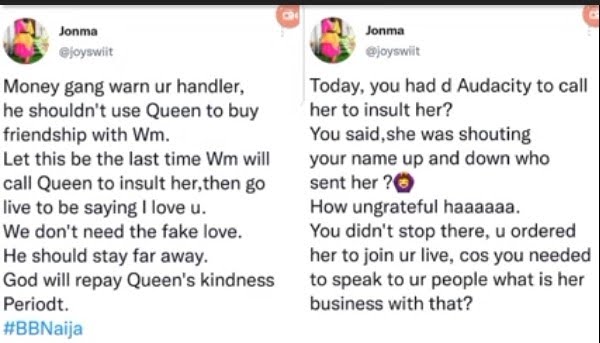 “Money gang warn ur handler, he shouldn’t use Queen to buy friendship with WhiteMoney.
