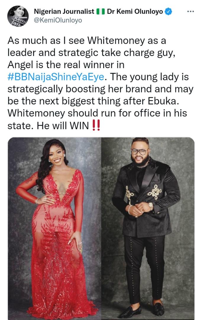 “As much as I see Whitemoney as a leader and strategic take charge guy, Angel is the real winner in #BBNaijaShineYaEye. The young lady is strategically boosting her brand and may be the next biggest thing after Ebuka. Whitemoney should run for office in his state. He will WIN”