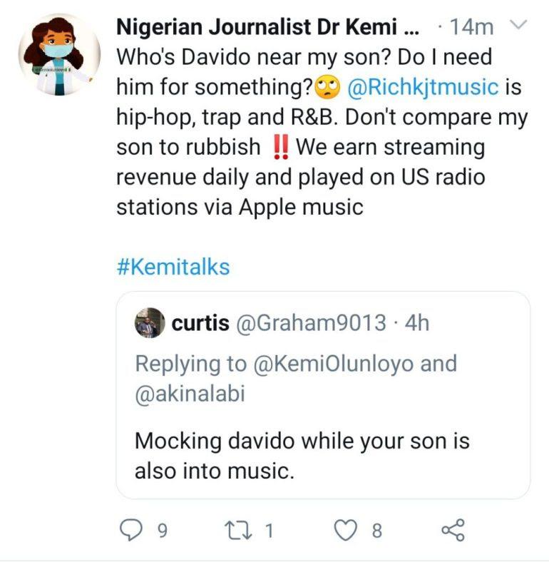 “Who’s Davido near my son? Do I need him for something? @Richkjtmusic is hip-hop, trap and R&B. Don’t compare my son to rubbish !! We earn streaming revenue daily and played on US radio stations via Apple music #Kemitalks.”
