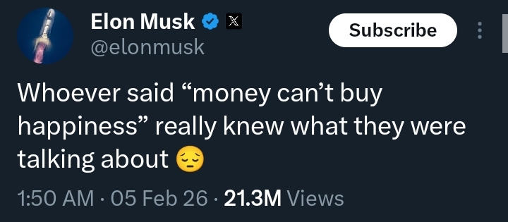 In a post on X, Musk wrote: “Whoever said ‘money can’t buy happiness’ really knew what they were talking about.”