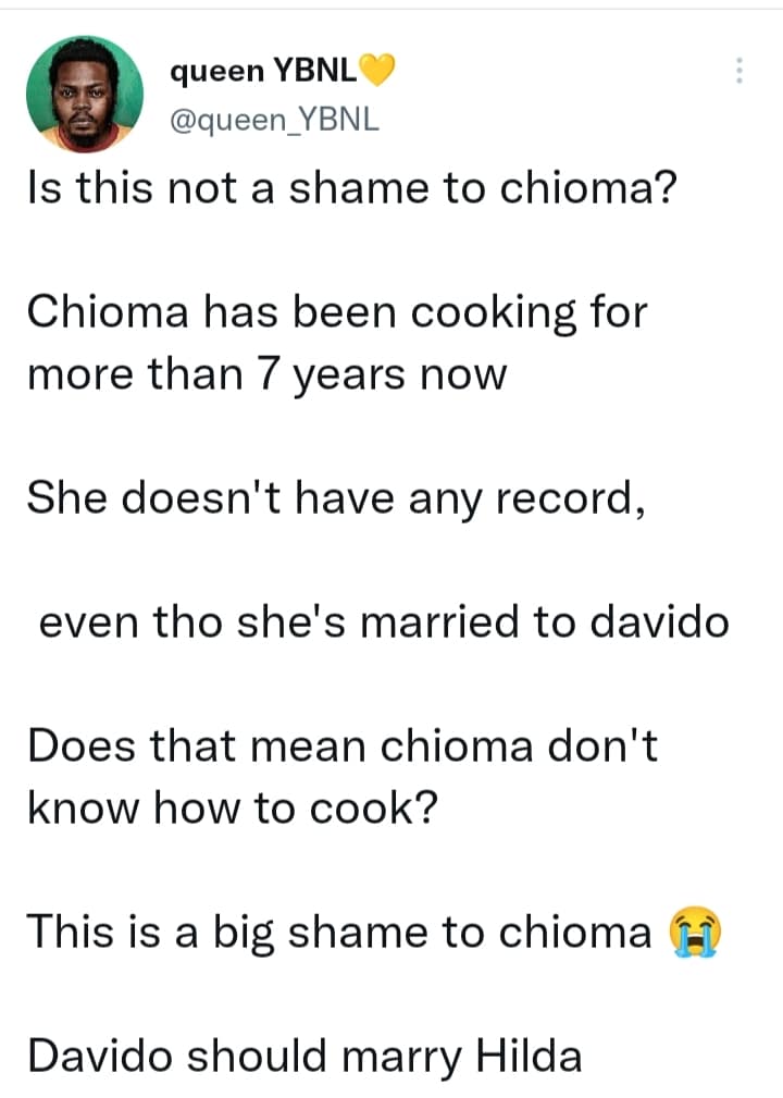 Does that mean Chioma don’t know how to cook? This is a big shame to Chioma 😭. Davido should marry Hilda.”
