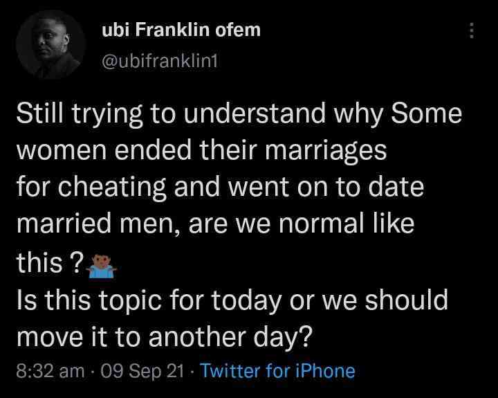 “Why do women end their marriages because of infidelity only to date married men” – Ubi Franklin